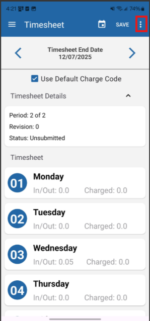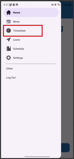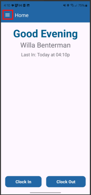 Once you are logged in and on the home page of the mobile app, click on the hamburger menu on the top left and navigate to your timesheet.