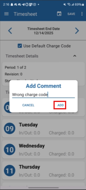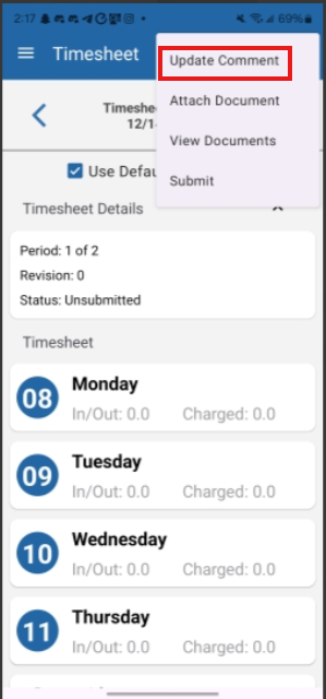 Once you have opened the timesheet, click on the three dot menu in the top right corner and select the timesheet comment option. You can type you comment directly into the space provided and click "ADD" to save it.