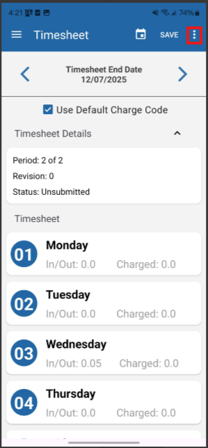 Once on your timesheet, click the three dot menu that appears at the top right corner followed by the submit button.